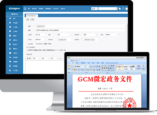 實現公文發文擬稿、收文處理、公文查閱的一體化公文管理,支持發文套紅和電子印章