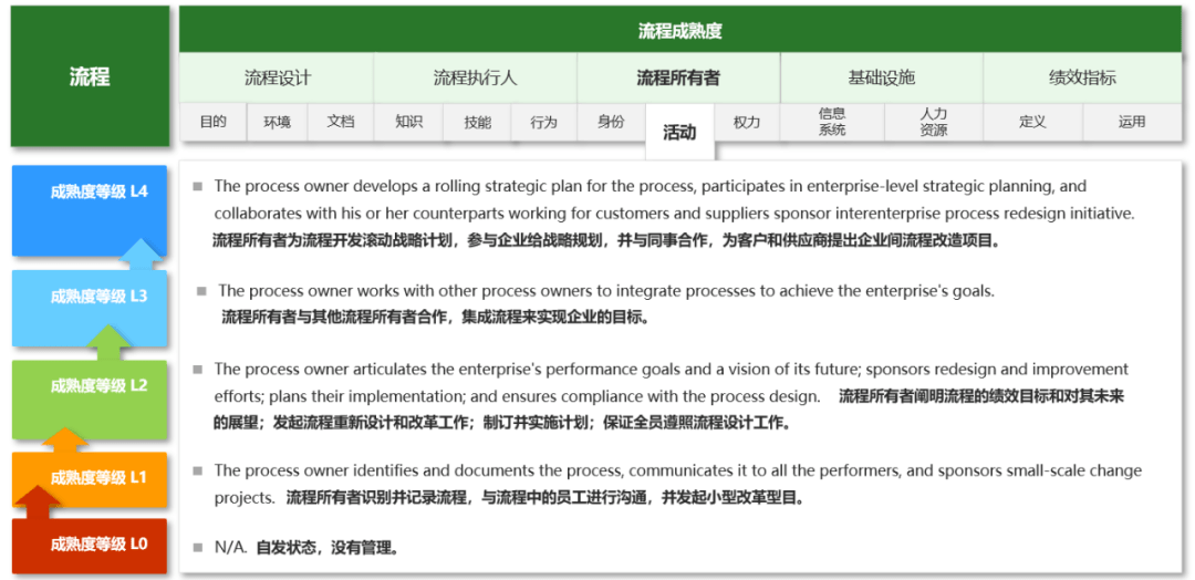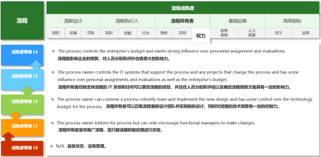 該模型運用在關鍵流程評價的意義在于,企業可以對照各因素等級所描述的情況評定流程的等級,尋找短板所在,同時明確改進的方向(低等級往高等級提升)。我們建議由流程經理組織流程參與者共同討論確定等級,這樣的結果相對來說更為客觀。